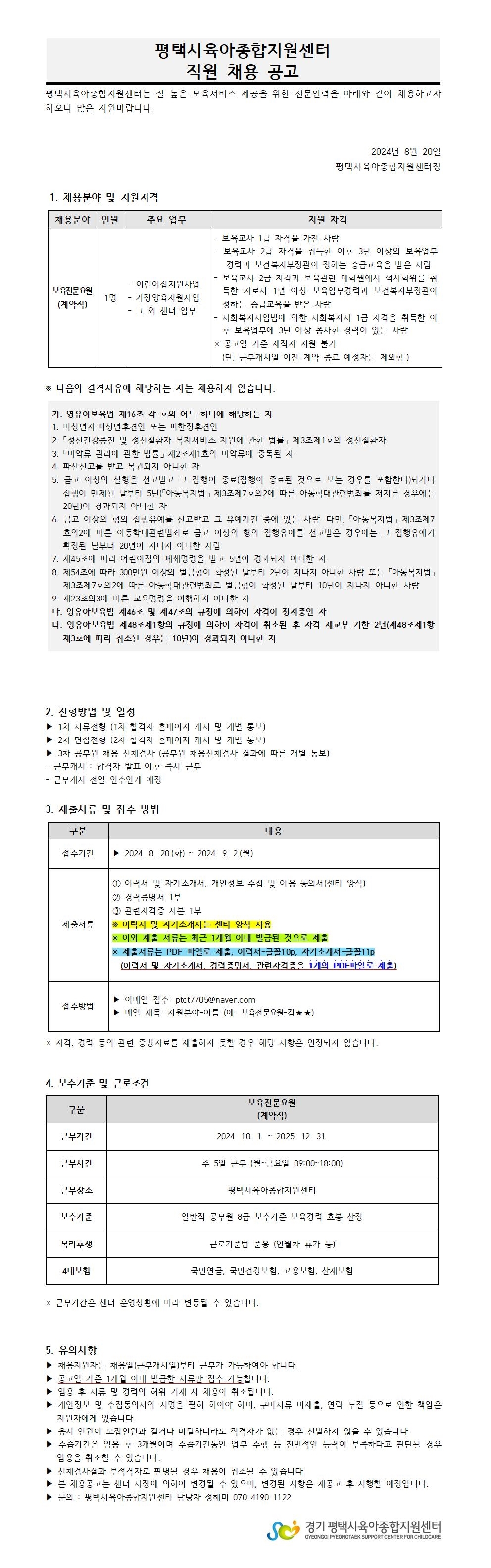 [평택시육아종합지원센터] 직원 채용 공고 - 보육전문요원