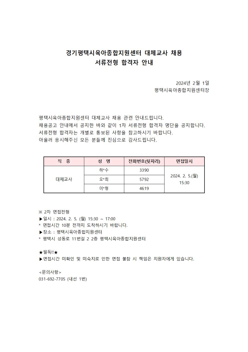 [평택시육아종합지원센터] 대체교사채용 1차 서류전형 합격자 안내