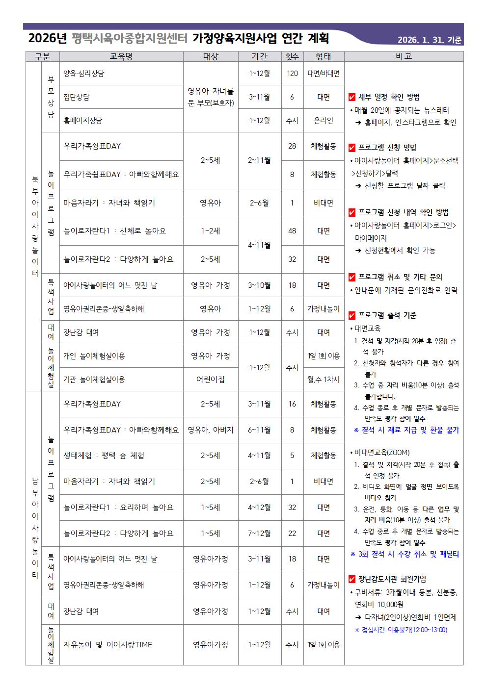 | [평택시육아종합지원센터] 2026년 가정양육지원사업 연간 계획 안내 | |||||
