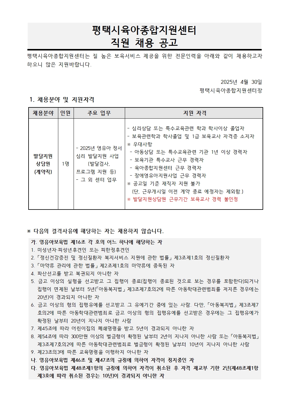 [평택시육아종합지원센터] 직원 채용 공고(발달지원상담원)