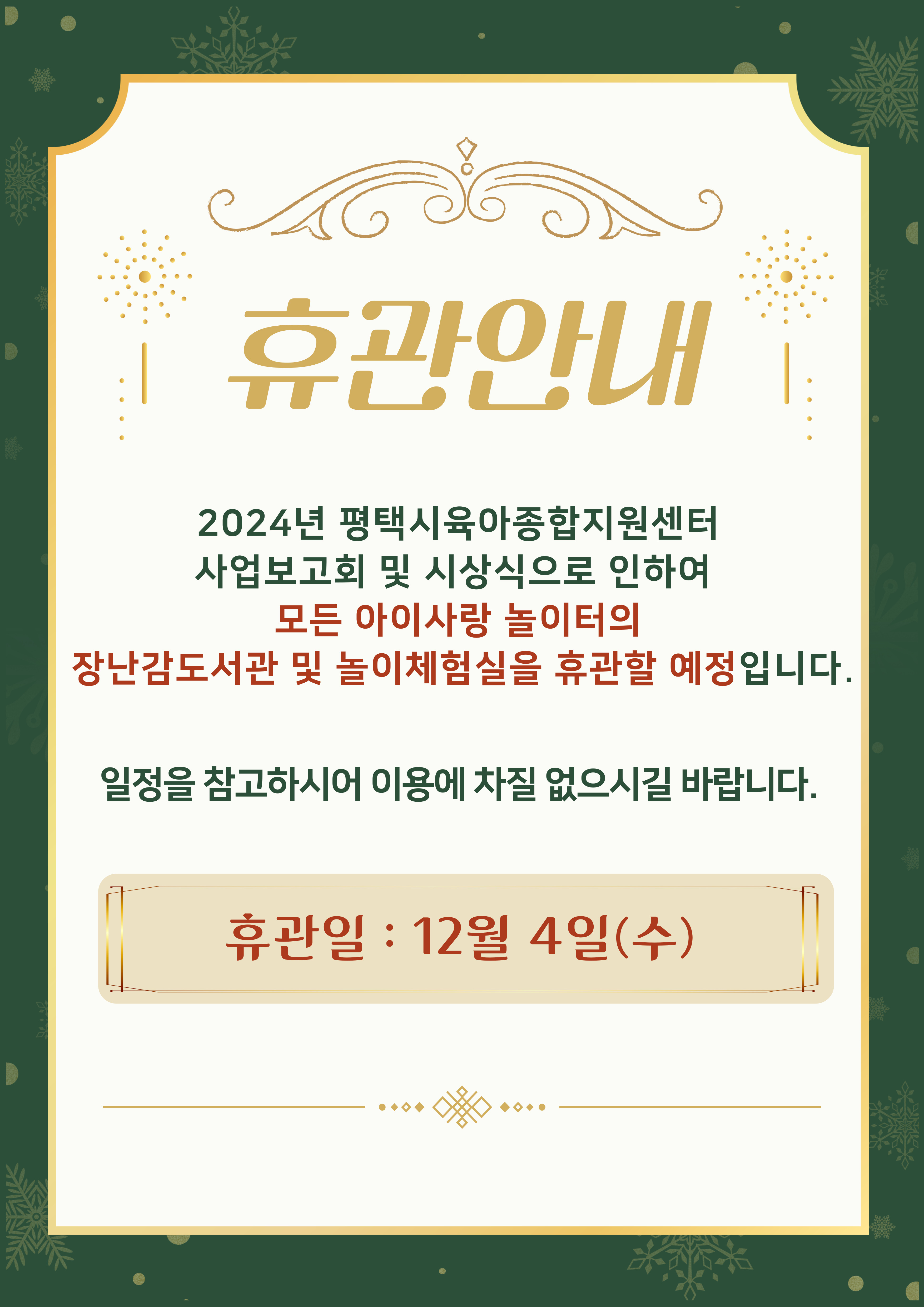 [북부아이사랑놀이터] 12월 4일(수) 장난감도서관 및 놀이체험실 휴관 안내