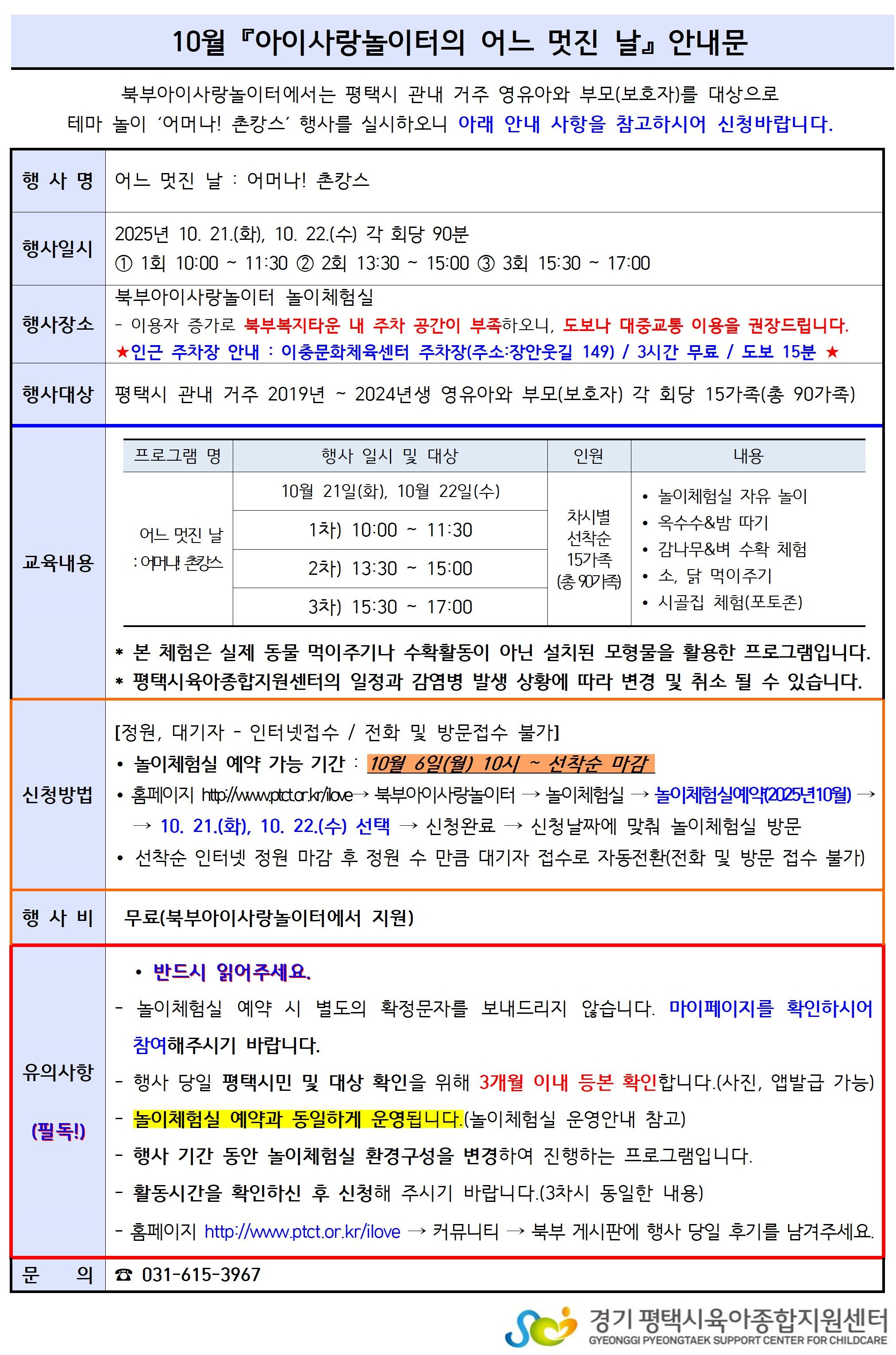- 신청방법은 북부아이사랑놀이터 놀이체험실 예약방법과 동일하며, 10. 6.(월) 10:00부터 신청 가능합니다. (안내문 참고)