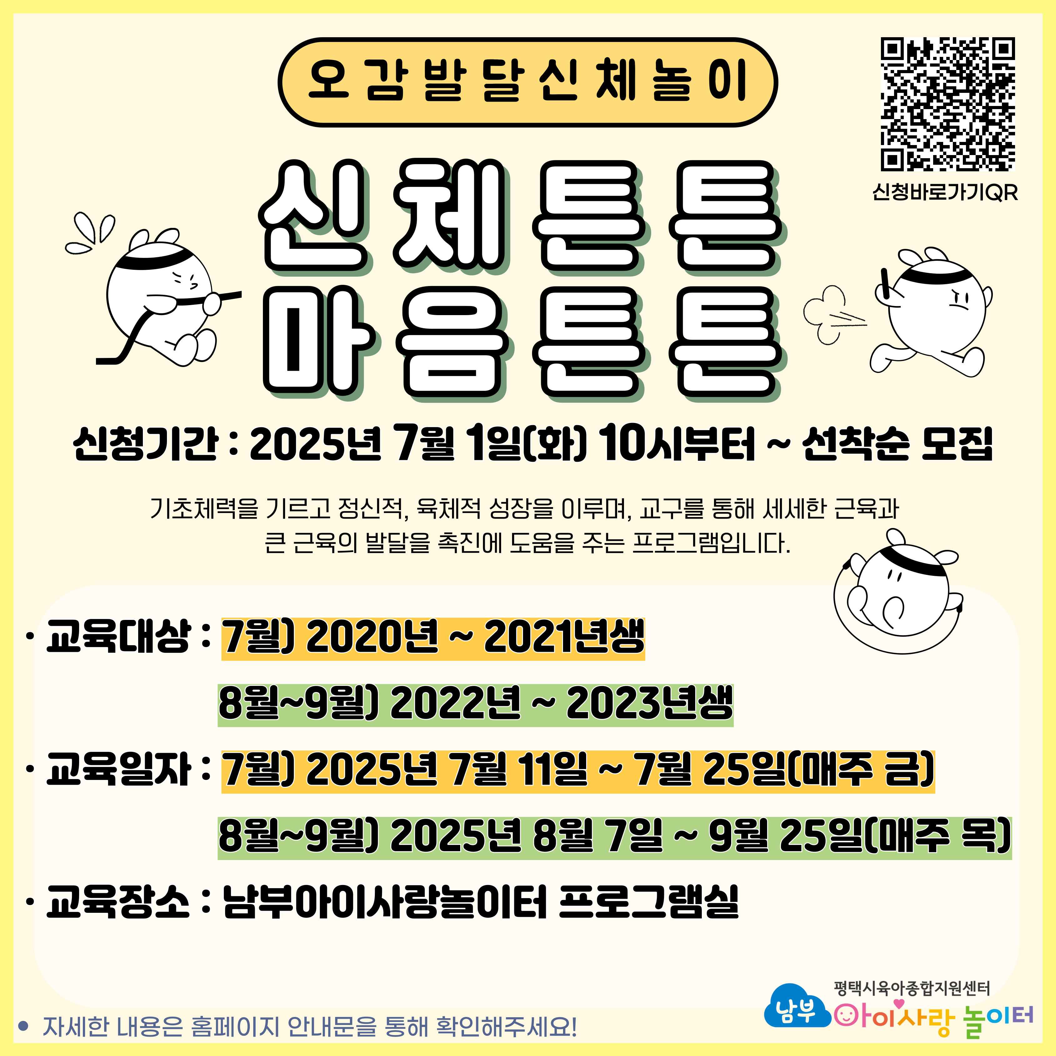 | *7. 1.(화)신청*[오/소] 2020년~2023년생 신체튼튼 마음튼튼(년생별 교육일시 상이) | |||||