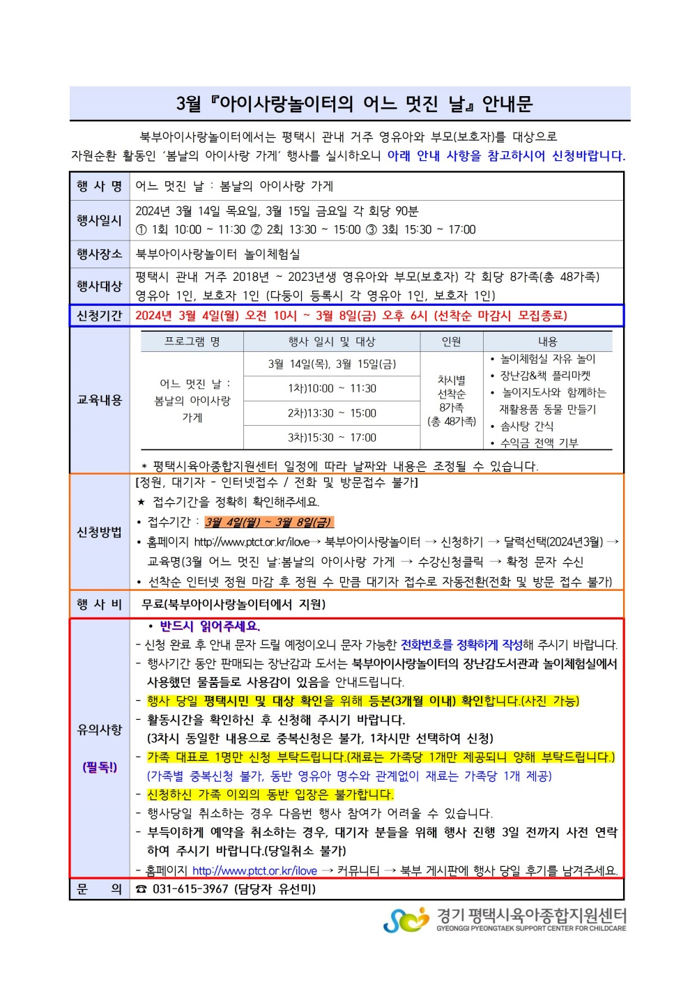 부득이하게 예약을 취소하는 경우, 대기자분들을 위해 행사 3일전까지 북부아이사랑놀이터로   연락하여 취소 처리하시기 바랍니다.(당일취소 불가)