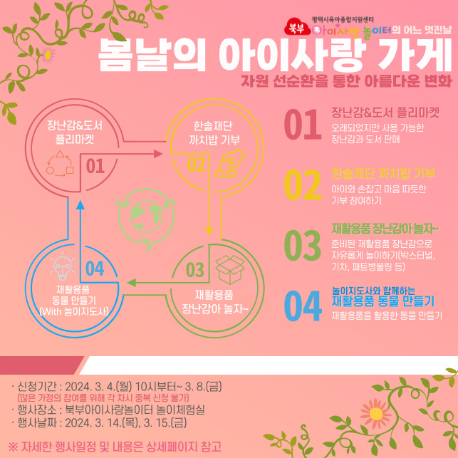 놀이체험실에서 진행되는 장난감&도서 플리마켓, 다양한 재활용 장난감 자유 놀이, 놀이지도사와 함께하는 재활용품 동물만들기 체험, 솜사탕 간식 등 행사가 준비되어 있으니 가족과 함께 참여해 주세요.