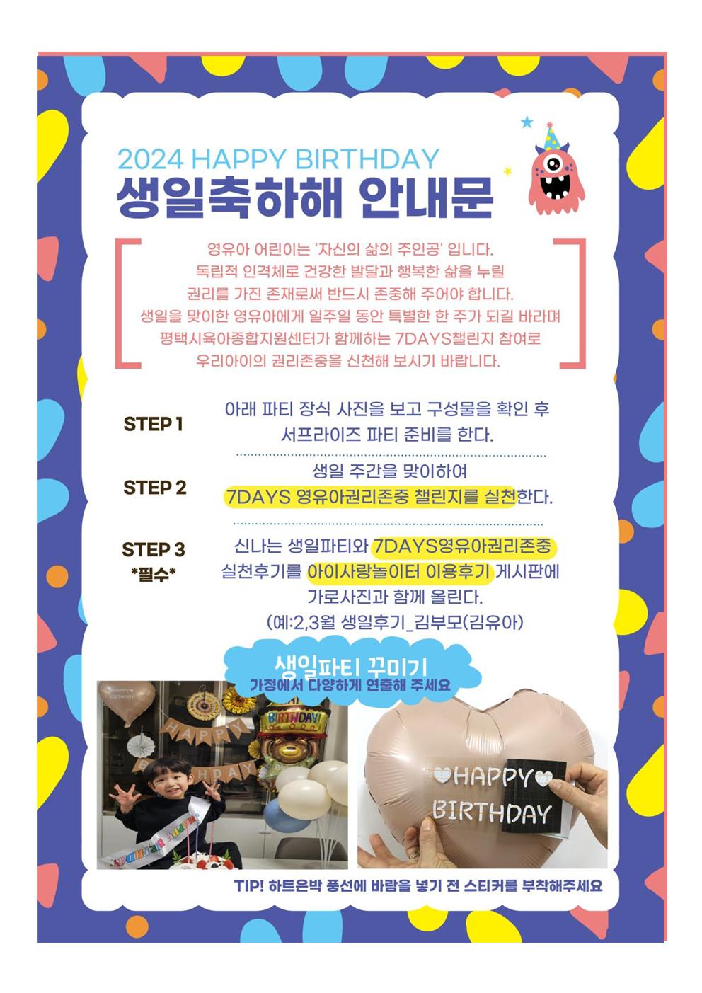 - 생일을 축하해주는 의미의 행사인 만큼 영유아의 생일 해당 월에 신청해 주시기 바랍니다.