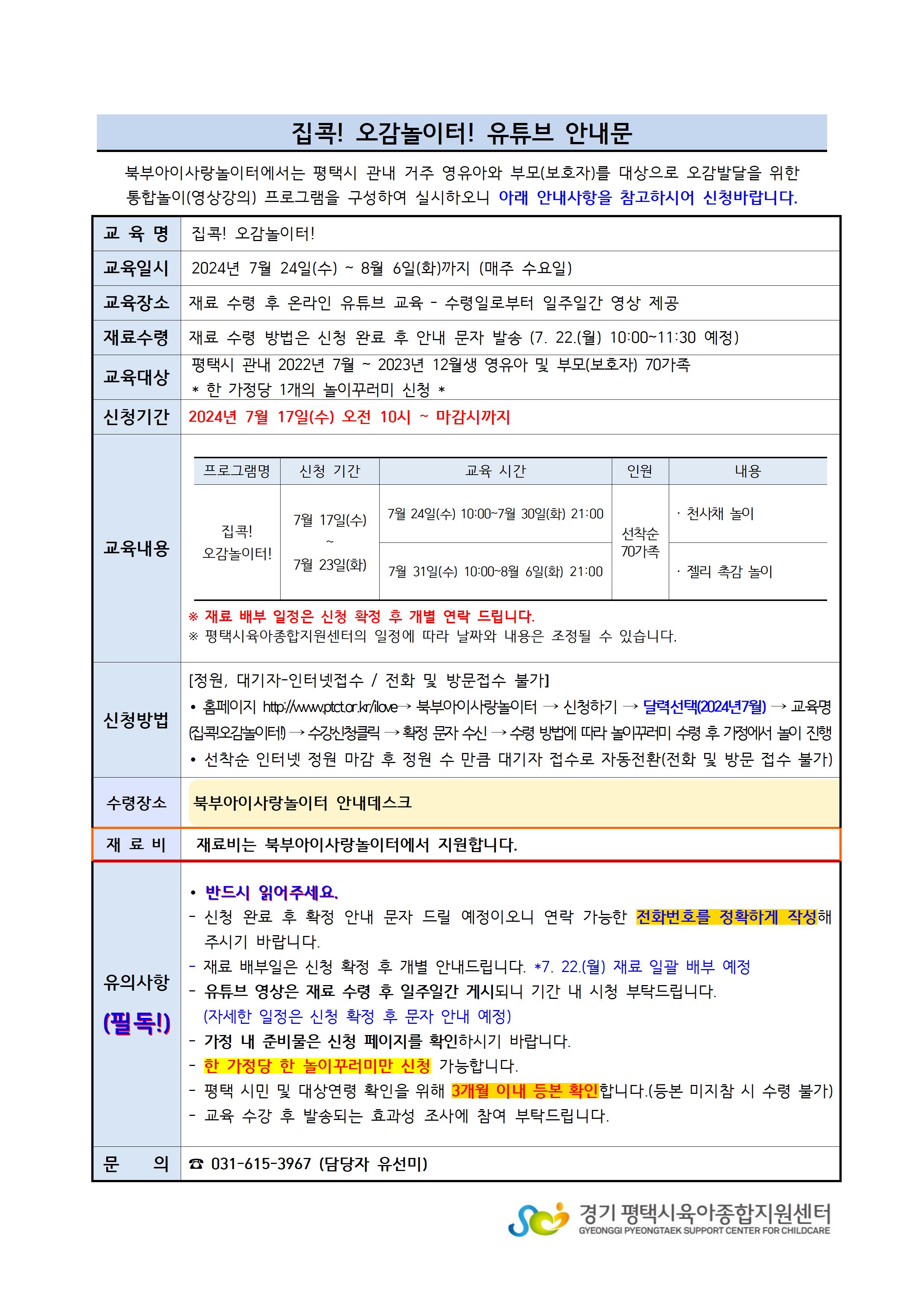▶ 신청 대상 : 2022년 7월 ~ 2023년 12월생 영유아 70가족 ▶ 신청 일시 : 7월 17일 (수) 오전 10시 ~ 선착순 마감 ▶ 교육일 : 2024. 7. 24.(수) ~ 2024. 7. 31.(수) 매주 수요일 10:00 유튜브 URL 발송(일주일간 시청 가능) ▶ 재료 수령 일시 : 신청 마감 후 문자로 개별 연락(1,2회차 재료 수령일 7. 22.(수) 10:00~11:30 예정) 많은 가정의 참여를 위해 당일 미수령 시 신청이 자동으로 취소되며 차순위에게 넘어갑니다. ▶ 재료 수령 장소 : 북부아이사랑놀이터 안내데스크 * 반드시 읽어주세요 * - 신청 완료 후 확정 안내 문자를 드릴 예정이오니 연락 가능한 전화번호를 정확하게 작성 바랍니다. - 재료 배부일은 신청 확정 후 개별 안내드립니다. ** 7. 22.(월) 재료 일괄 배부 예정 - 7/24(수), 7/31(수) 10:00에 유튜브 URL이 전송됩니다. (URL은 프로그램 신청자에 한해 일주일간 제공되며 공유가 불가합니다.) - 한 가정당 한 놀이꾸러미만 신청 가능합니다. - 평택 시민 및 연령확인을 위해 3개월 이내 등본 확인합니다.(등본 미지참시 수령 불가)