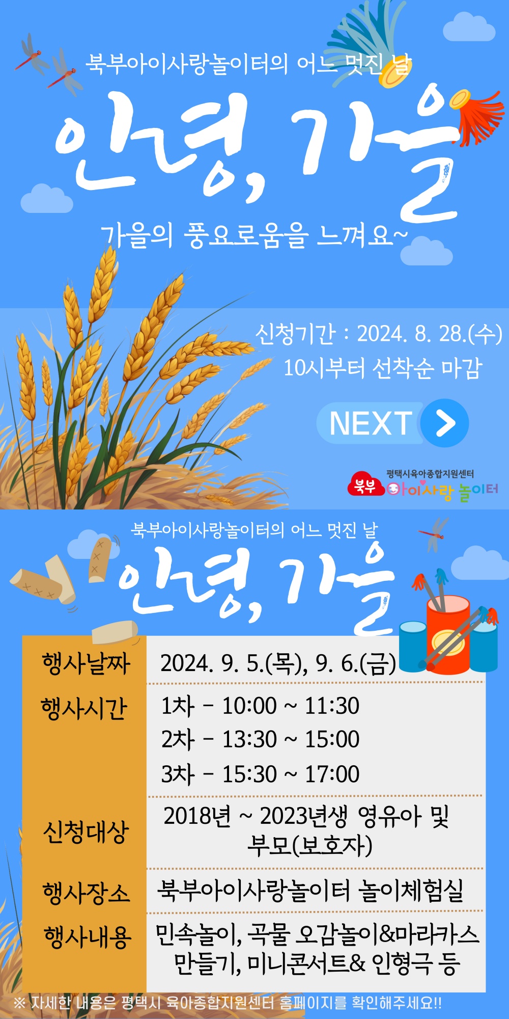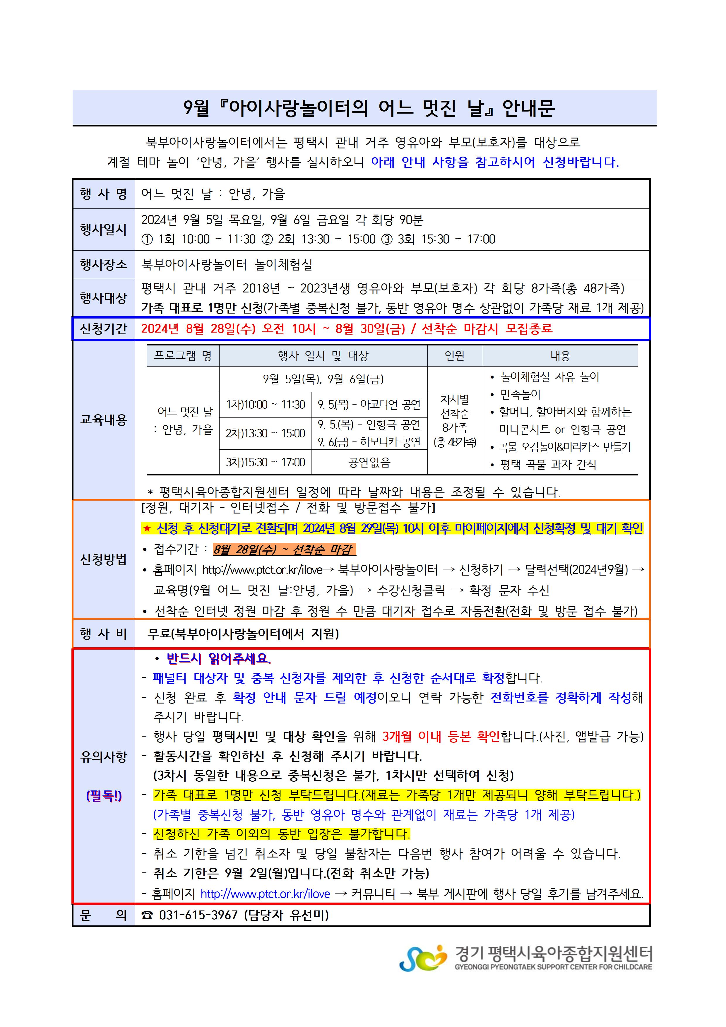 북부복지타운(송탄보건소) 내 이용자가 증가하여 주차장 이용이 어려울 수 있습니다. 도보나 대중교통을 이용하시어 방문해주시면 감사하겠습니다. * 근처 주차장 안내 : 이충레포츠공원주차장(경기도 평택시 장안웃길 149) / 도보 10분 어느 멋진 날 : 안녕, 가을 (2차시) 본 프로그램은 놀이체험실 대면 행사로 2024년 9월 5일(목) 13:30~15:00에 진행됩니다. 놀이체험실에서 진행되는 할머니, 할아버지와 함께하는 미니콘서트 & 인형극 공연(안내문에서 공연 일정 사전 확인), 민속놀이, 곡물 오감놀이&마라카스 만들기, 평택 곡물로 만든 과자 간식 등 행사가 준비되어 있으니 가족과 함께 참여해 주세요.