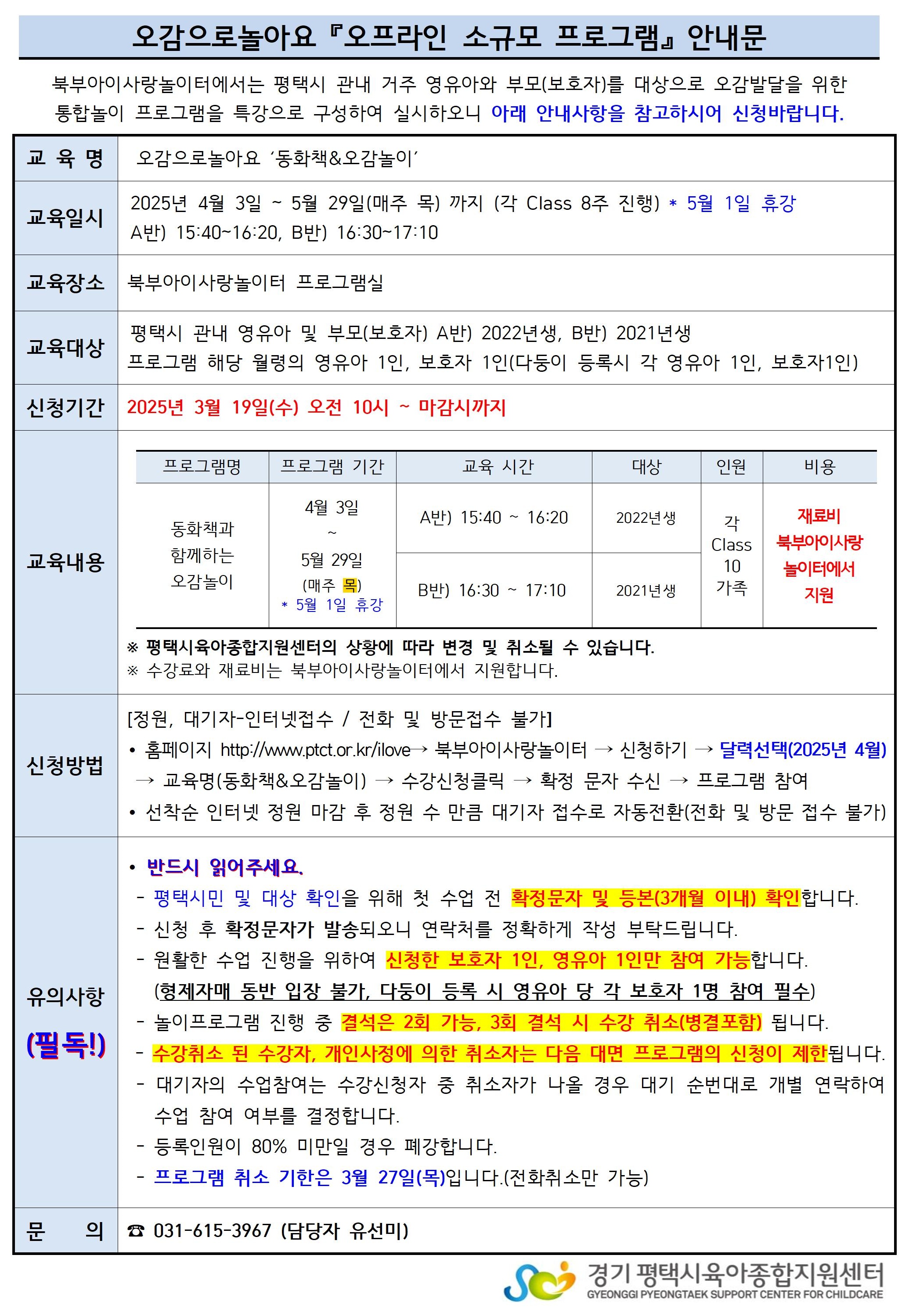 북부아이사랑놀이터 프로그램실에서 4. 3.(목) ~ 5. 29.(목) 15:40~16:20(40분) 총 8회 진행됩니다.