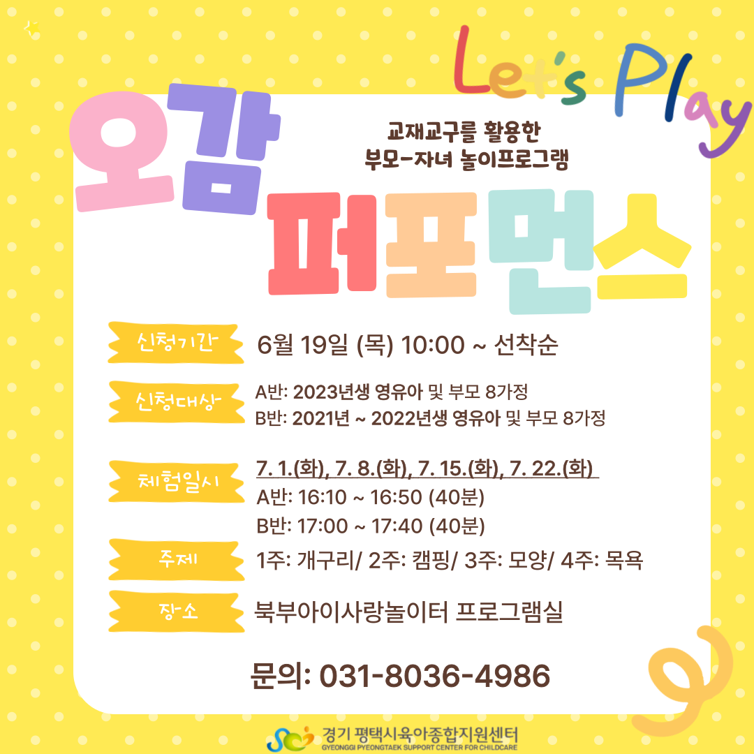 7월 1일(화) / 7월 8일(화) / 7월 15일(화) / 7월 22일(화) 16:10 ~ 16:50 에 진행됩니다. (30분 놀이 후 정리 및 마무리) * * 반드시 읽어주세요 * * - 평택시 시민 및 대상연령 확인을 위해 수업 1회차에 3개월 이내 등본 확인합니다.(사진 가능) - 프로그램 안내 사항은 문자 발송 되니 연락처를 정확하게 작성 부탁드립니다. - 등록인원이 80% 미만일 경우 폐강합니다. - 원활한 수업진행을 위하여 형제, 자매의 동반 입장은 불가합니다. (영유아1인, 보호자1인 한 팀으로만 수강 가능, 다둥이 등록시 영유아당 각 보호자 1명) - 대기자의 수업참여는 수강신청자 중 취소자가 나올 경우 대기 순번대로 개별 연락하여 수업 참여 여부를 결정합니다. - 놀이프로그램 진행 중 결석은 1회 가능, 2회 결석시 수강 취소(병결포함) 됩니다. - 수강취소 된 수강자는 다음 놀이지도사 프로그램의 신청이 제한됩니다.(수강생 본인의 사정에 의한 취소도 동일)