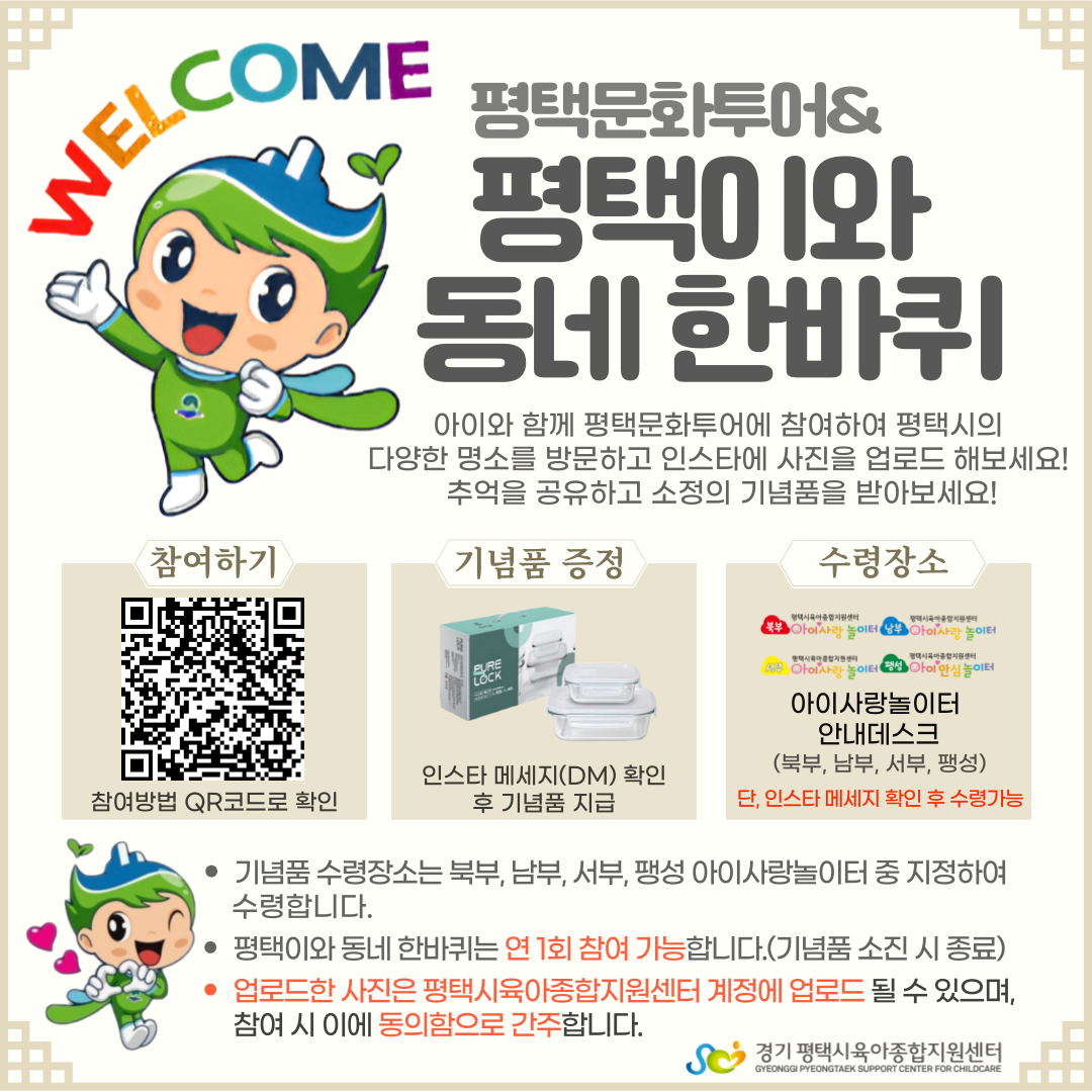 - 10월, 11월 평택문화투어 중복신청 불가(총 2회 중 1회 선택) / 연간 5회 프로그램 참여 제한에 포함되지 않습니다. - 신청 후 확정문자를 받으신 분만 확정이 완료되오니 유의해주시기 바랍니다.(전화 안내 없음) - 투어형 프로그램으로 여행자보험을 가입해야합니다. 아래 첨부된 안내문 내용을 확인하시기 바랍니다. ![]() ![]() ![]() ![]() |