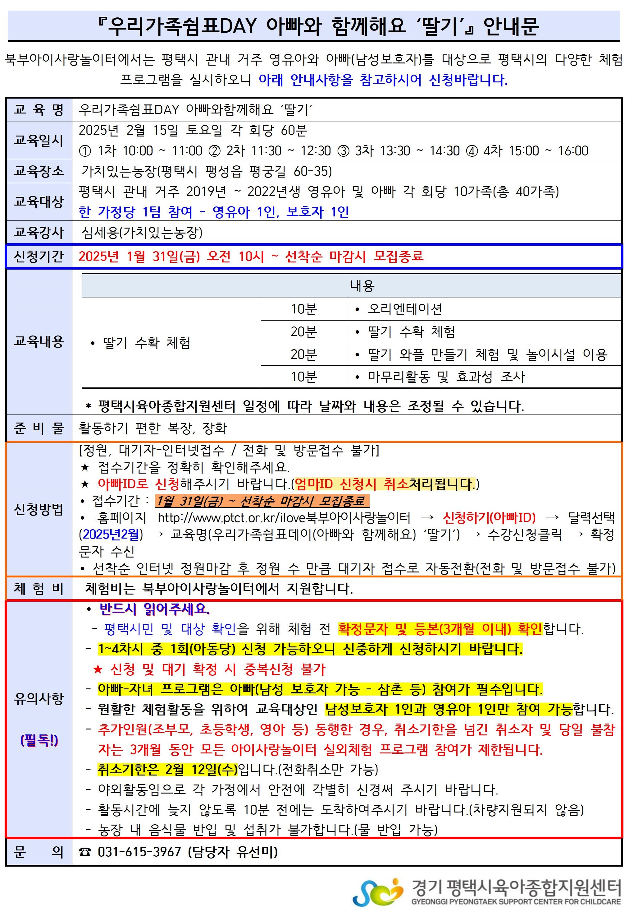 | *1. 31.(금)신청*[오/소] 우리가족 쉼표데이 아빠와 함께해요. '딸기' B반(2차) | |||