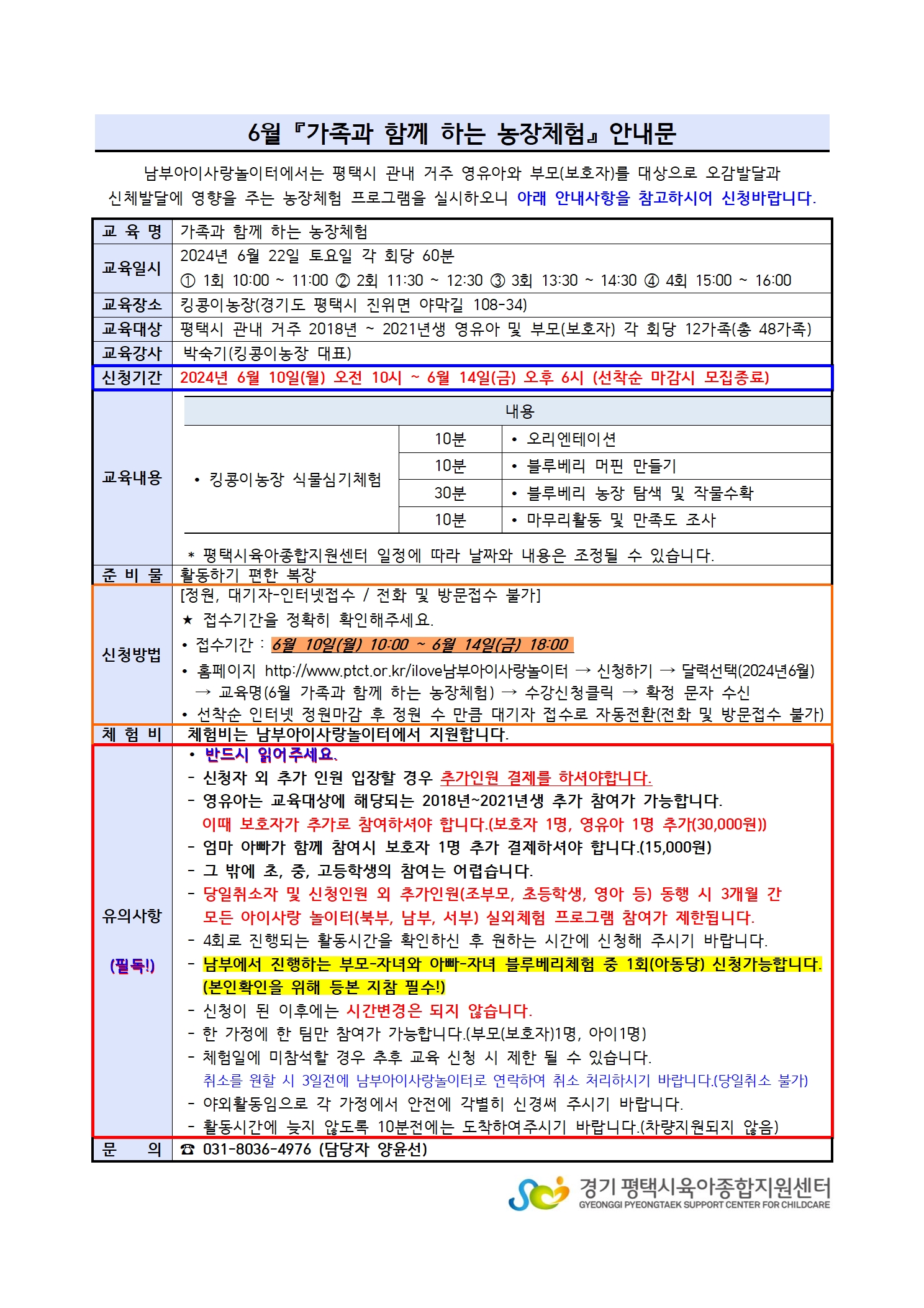 ※ 아래 내용을 꼭 읽어주세요 ! - 4회로 진행되는 활동시간을 확인하신 후 원하는 시간에 신청해 주시기 바랍니다. - 회차별 같은 프로그램으로 중복 신청은 불가 합니다. - 아빠-자녀 블루베리체험 6. 15.(토) 같은 프로그램으로 중복 신청은 불가 합니다. - 신청이 된 이후에는 시간변경은 되지 않습니다. - 한 가정에 한 팀만 참여가 가능합니다(부모(보호자)1명, 아이 1명) 추가인원 결제 - 체험일에 미참석할 경우 추후 교육 신청 시 제한 될 수 있습니다. - 야외활동임으로 각 가정에서 안전에 각별히 신경써 주시기 바랍니다. - 활동시간에 늦지 않도록 10분전에는 도착하여주시기 바랍니다.(차량지원되지 않음.)