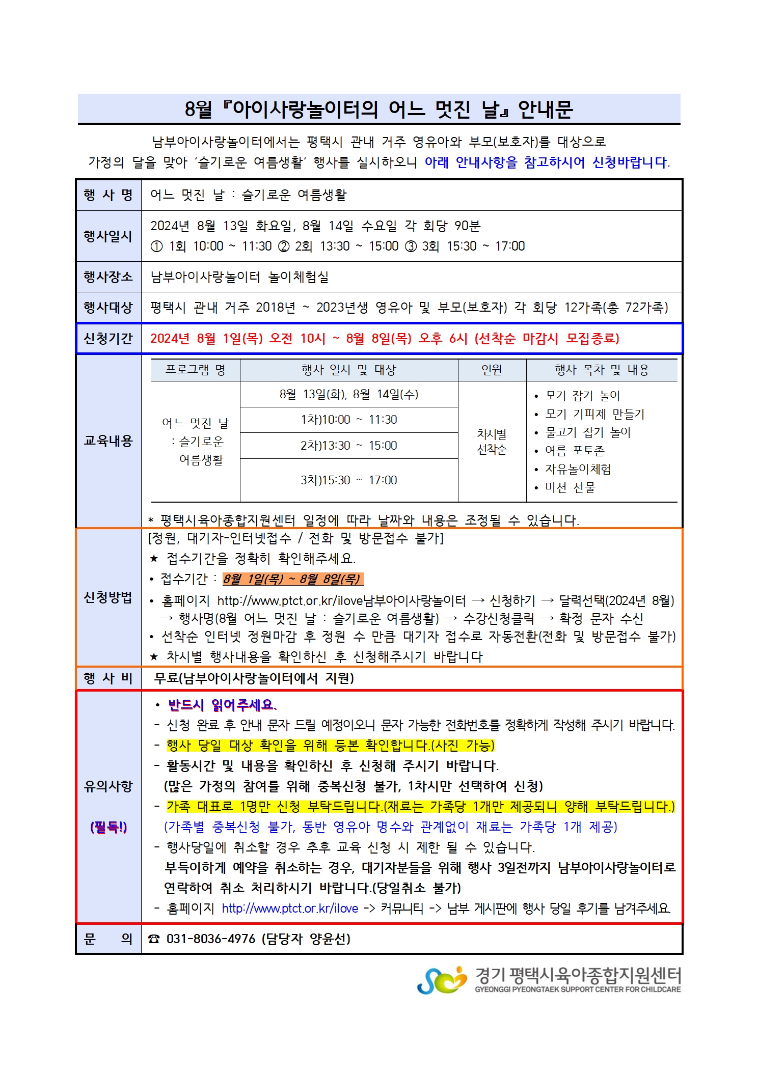※ 아래 내용을 꼭 읽어주세요 ! - 신청 완료 후 안내 문자 드릴 예정이오니 문자 가능한 전화번호를 정확하게 작성해 주시기 바랍니다. - 행사 당일 평택시 시민과 대상 확인을 위해 3개월 이내 등본 확인합니다.(사진 가능) - 활동시간을 확인하신 후 신청해 주시기 바랍니다. (6차시 같은 내용으로 중복신청 불가, 1차시만 선택하여 신청) - 가족 대표로 1명만 신청 부탁드립니다.(재료는 가족당 1개만 제공되니 양해 부탁드립니다.) (가족별 중복신청 불가, 동반 영유아 명수와 관계없이 재료는 가족당 1개 제공) - 행사당일에 취소할 경우 추후 교육 신청 시 제한 될 수 있습니다. 부득이하게 예약을 취소하는 경우, 대기자분들을 위해 행사 3일전까지 남부아이사랑놀이터로 연락하여 취소 처리하시기 바랍니다.(당일취소 불가) - 홈페이지 http://www.ptct.or.kr/ilove -> 커뮤니티 -> 남부 게시판에 행사 당일 후기를 남겨주세요.