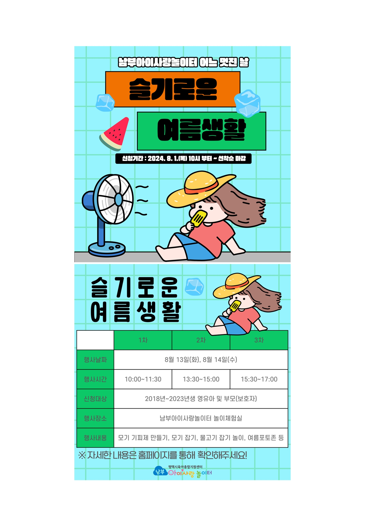 남부복지타운 내 이용자가 증가하여 주차장 이용이 어려울 수 있습니다. 도보나 대중교통을 이용하시어 방문해주시면 감사하겠습니다. 어느 멋진 날 : 슬기로운 여름생활 (1차시) 본 프로그램은 놀이체험실 대면 행사로 2024년 8월 14일(수) 10:00~11:30에 진행됩니다. 놀이체험실에서 진행되는 어느 멋진 날 행사에 가족과 함께 참여해 주세요. 행사내용 : 모기 기피제 만들기, 모기 잡기, 물고기 잡기 놀이, 여름 포토존 이벤트, 선물 등 행사가 준비되어 있으니 가족과 함께 참여해 주세요. ▶ 신청 대상 : 평택시 관내 2018년~2023년생 영유아 및 보호자 12가정 (가족 대표 1명 신청시 부모님과 영유아 형제자매(2018년~2023년생) 모두 참여 가능합니다.) ▶ 행사 일시 : 2024년 8월 14일(수) 10:00~11:30 ▶ 행사 내용 : 모기 기피제 만들기, 모기 잡기, 물고기 잡기 놀이, 여름 포토존, 이벤트선물