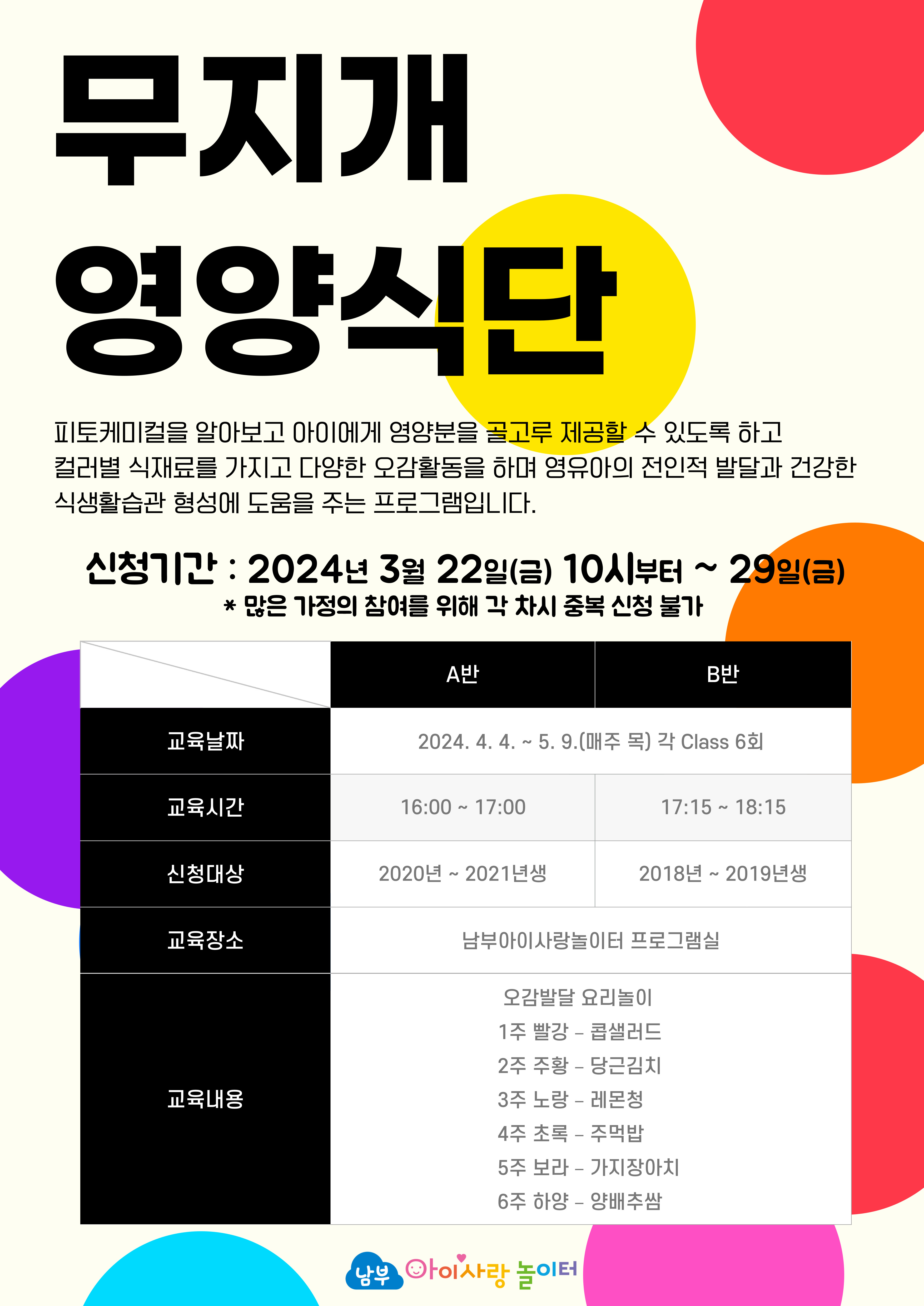 | *3. 22.(금) 신청* 2020년~2021년생 무지개 영양식단 A반 | |||