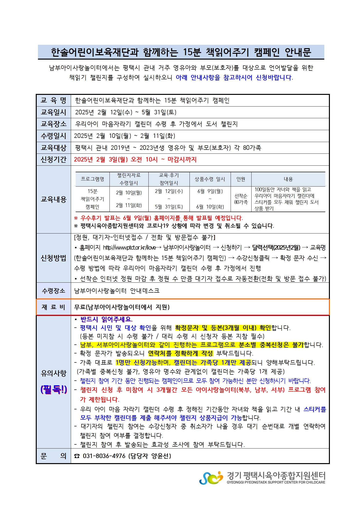 | *2. 3.(월) 신청* 한솔어린이보육재단과 함께하는 15분 책읽어주기 캠페인 | |||