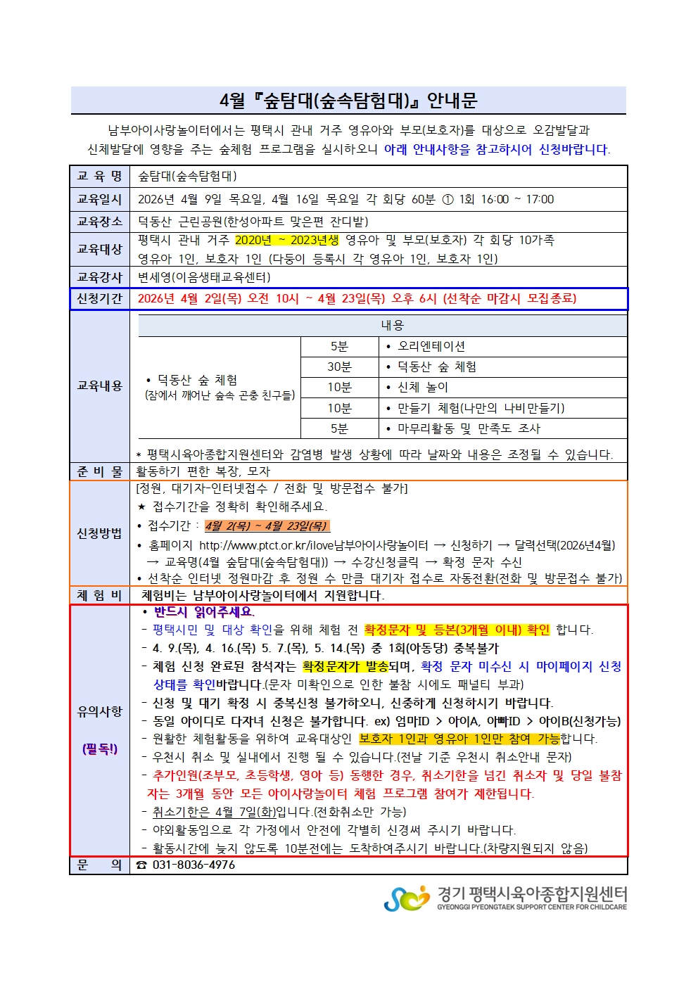| 접수대상 | 평택시 관내 거주 2020년 ~ 2021년생 영유아 및 부모(보호자) 10가족 | ||