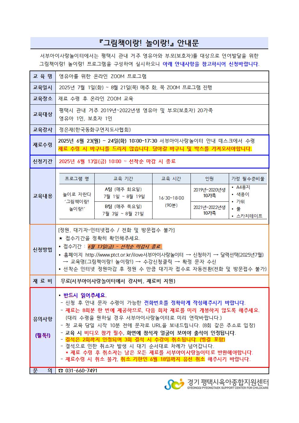 | 접수대상 | 2021년~2022년생 영유아 및 부모(보호자) 10가정 | ||