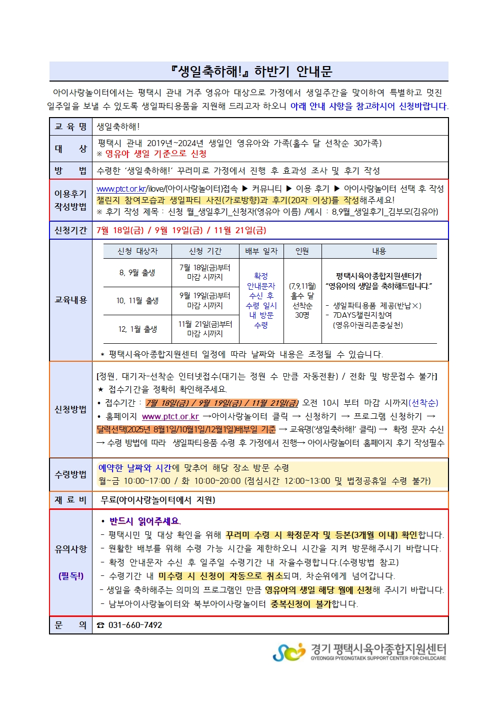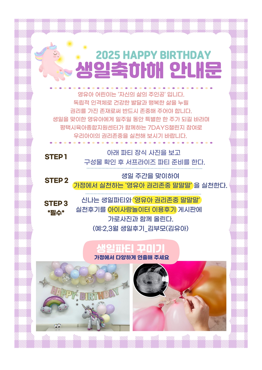 2025년 '생일 축하해' "일주일로 시작하는 영유아권리존중챌린지!" 평택시육아종합지원센터에서 생일달을 맞이한 아이가 멋지고 특별한 한주를 보낼 수 있도록 지원해드립니다!