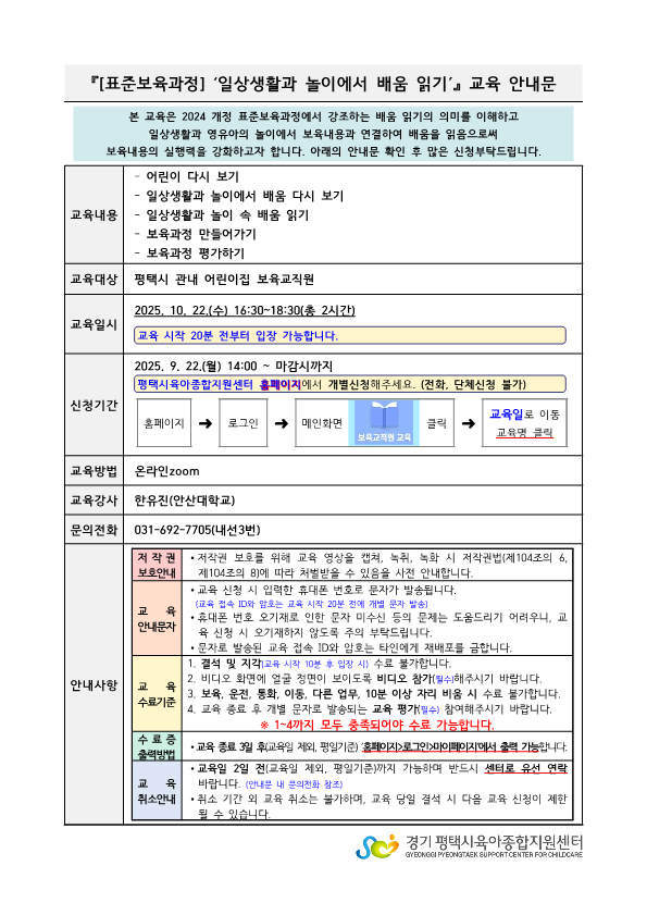 교육명 [표준보육과정] 일상생활과 놀이에서 배움 읽기 교육형태 온라인 zoom