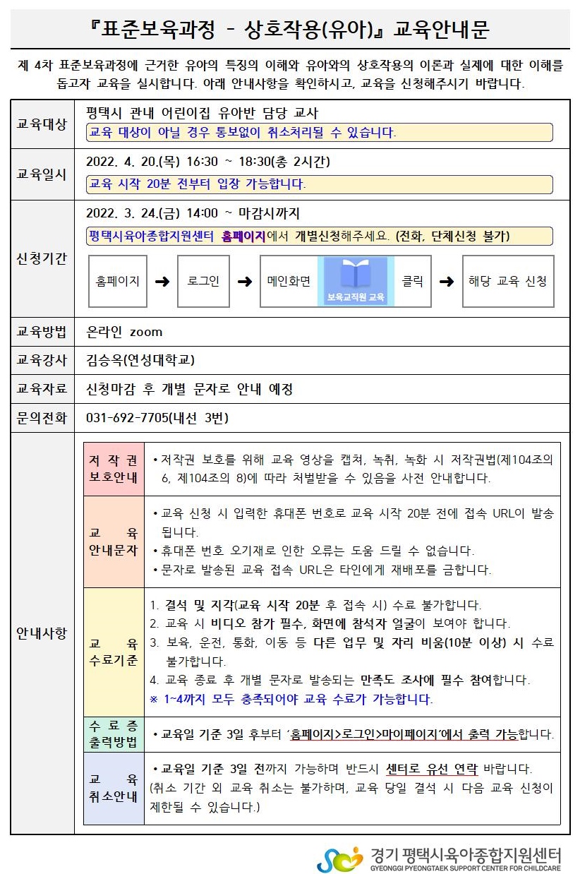 교육대상 평택시 관내 어린이집 유아반 담당교사 강사명 김승옥(연성대학교)