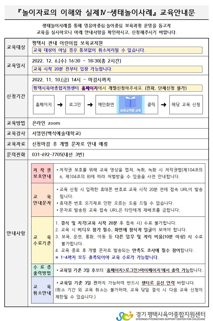 교육대상 평택시 관내 어린이집 보육교직원 강사명 서영민(백석예술대학교)