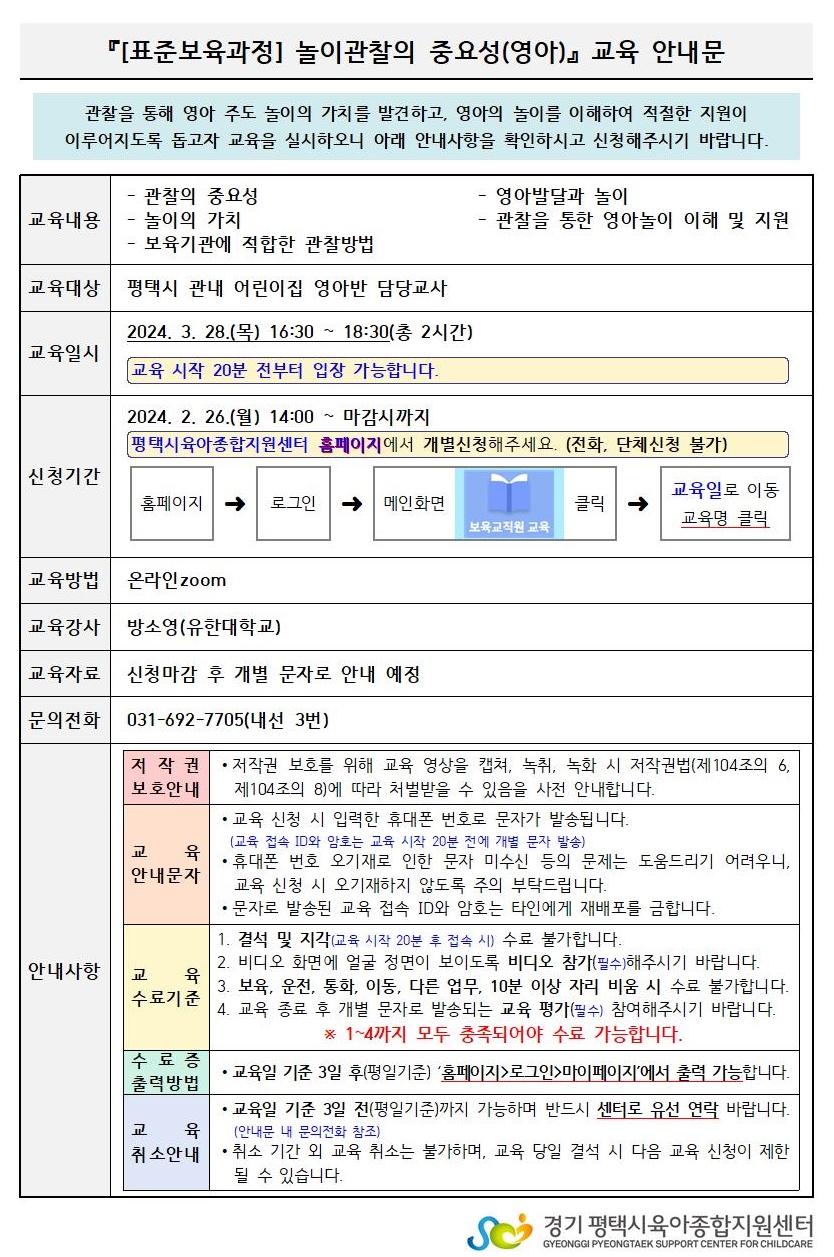 교육명 [표준보육과정] 놀이관찰의 중요성(영아) 교육형태 온라인 zoom