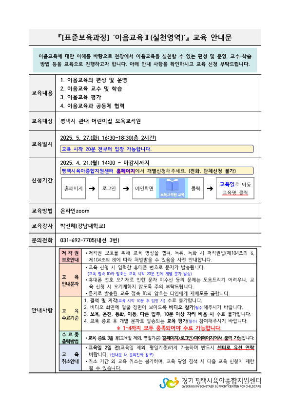 교육대상 평택시 관내 어린이집 보육교직원 강사명 박선혜(강남대학교)