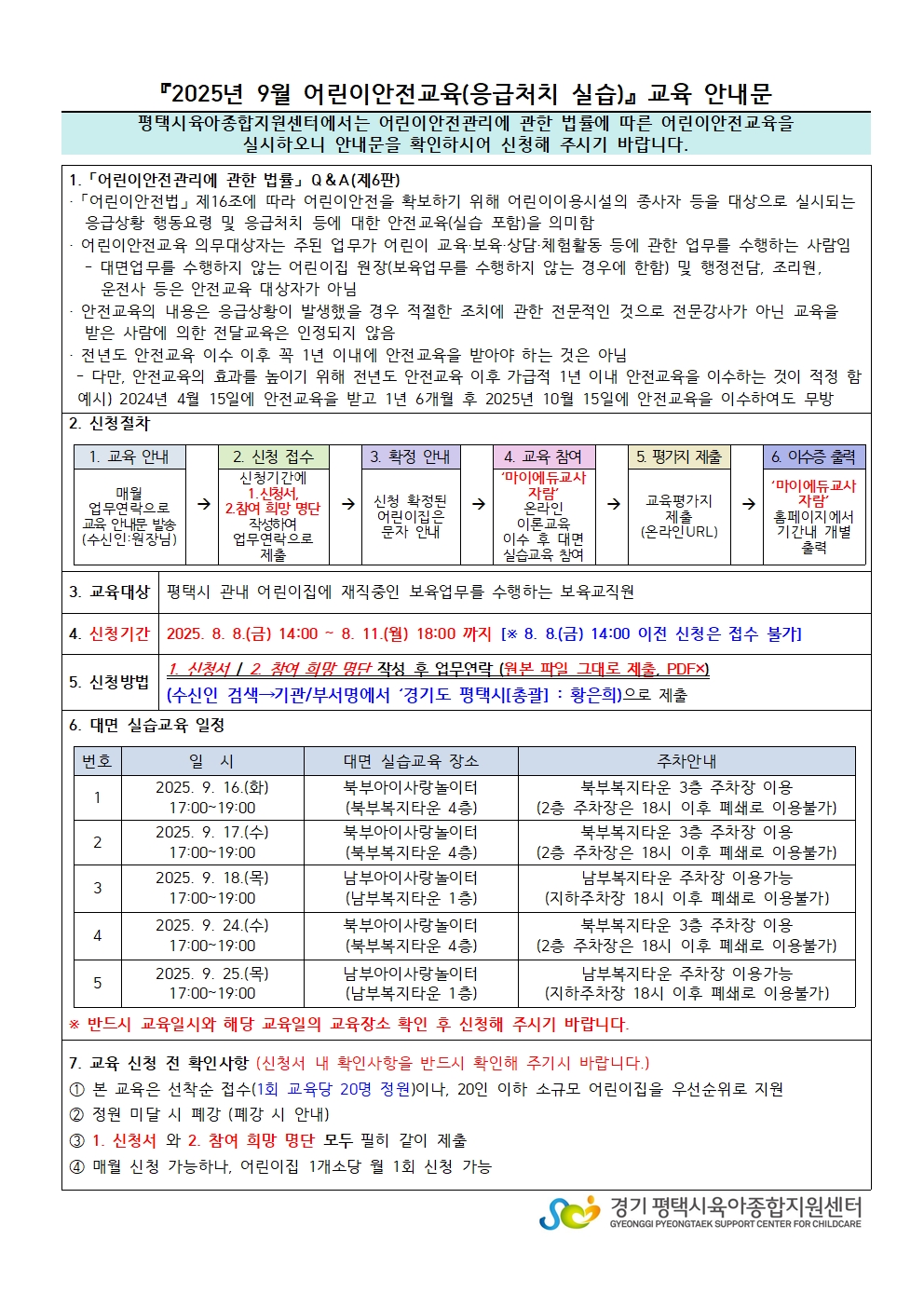 교육명 [안전교육] 9월 어린이안전교육(응급처치실습) 교육안내 - 업무연락으로 신청하기 교육형태 오프라인 소규모