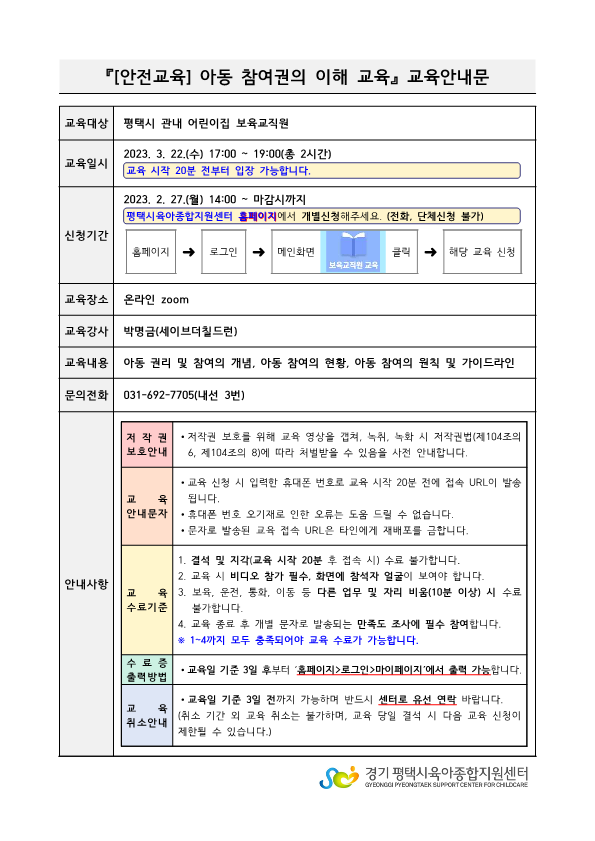 교육명 [안전교육] 아동 참여권 이해의 교육 교육형태 온라인 zoom