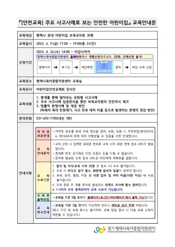 교육명 [안전교육] 주요 사고사례로 보는 안전한 어린이집 교육형태 오프라인 소규모
