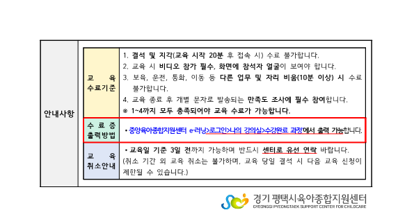 수료증 발급 역시 교육 종료 후 중앙 E-러닝에서 확인바랍니다.
