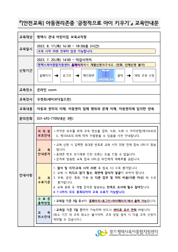 교육명 [안전교육] 아동권리존중 '긍정적으로 아이키우기' 교육형태 온라인 zoom