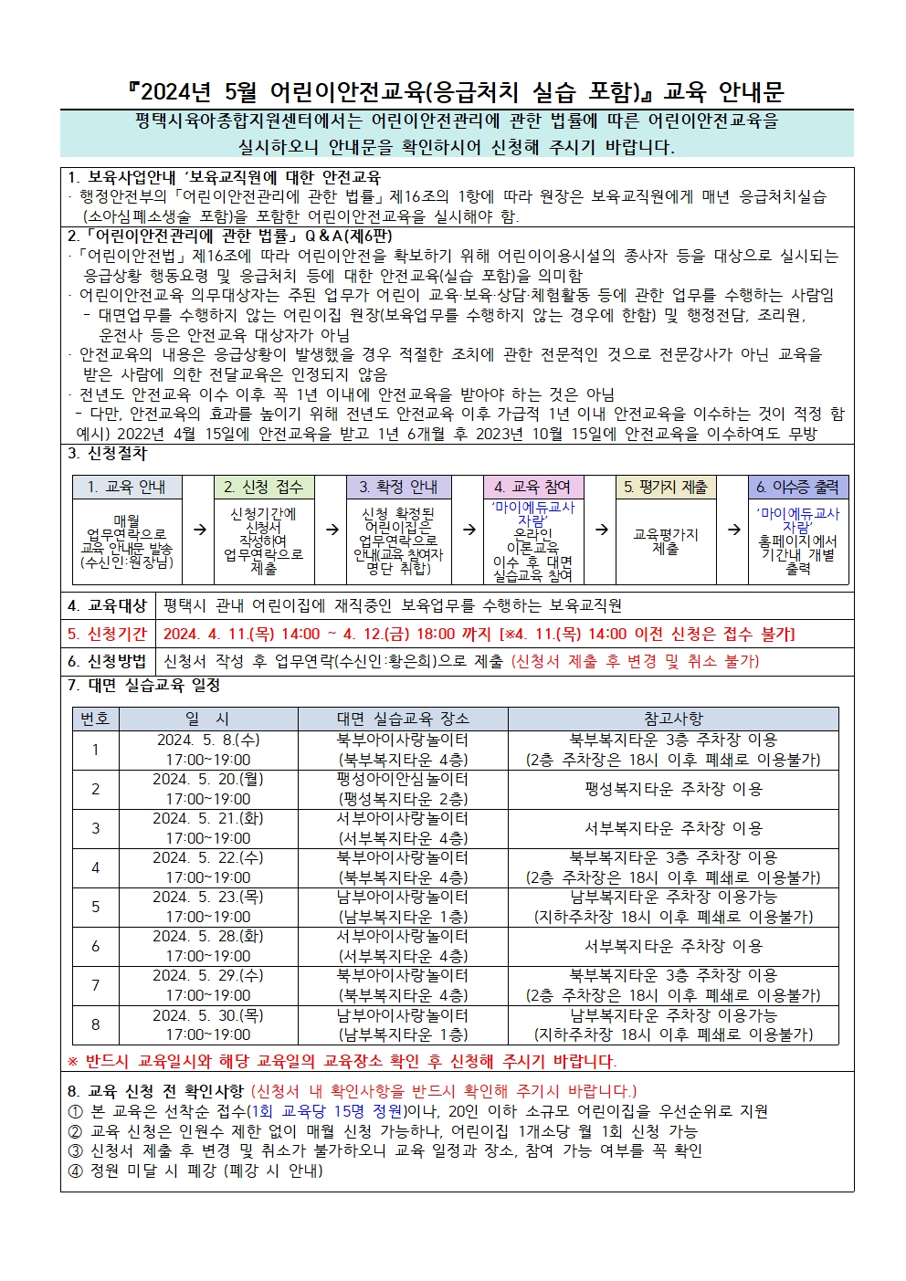 교육명 [안전교육] 5월 어린이안전교육(응급처치 실습) 교육안내 - 업무연락으로 신청하기 교육형태 오프라인 소규모