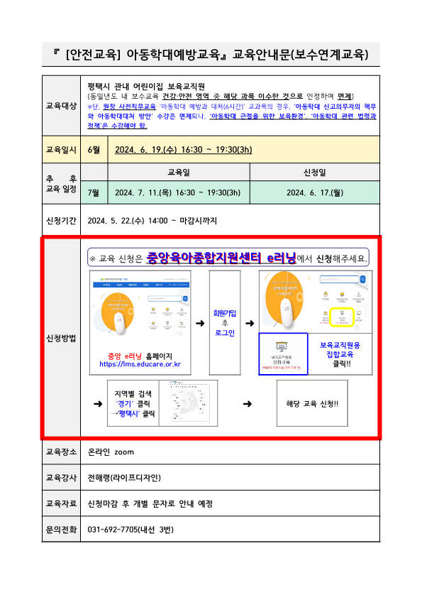 교육명 [안전교육] 6월 아동학대예방교육(보수연계교육) → ★중앙 e-러닝으로 신청★ 교육형태 온라인 zoom
