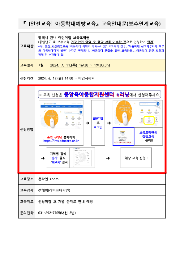 교육명 [안전교육] 7월 아동학대예방교육(보수연계안전교육)→ ★ 중앙 e-러닝에서 신청 ★ 교육형태 온라인 zoom