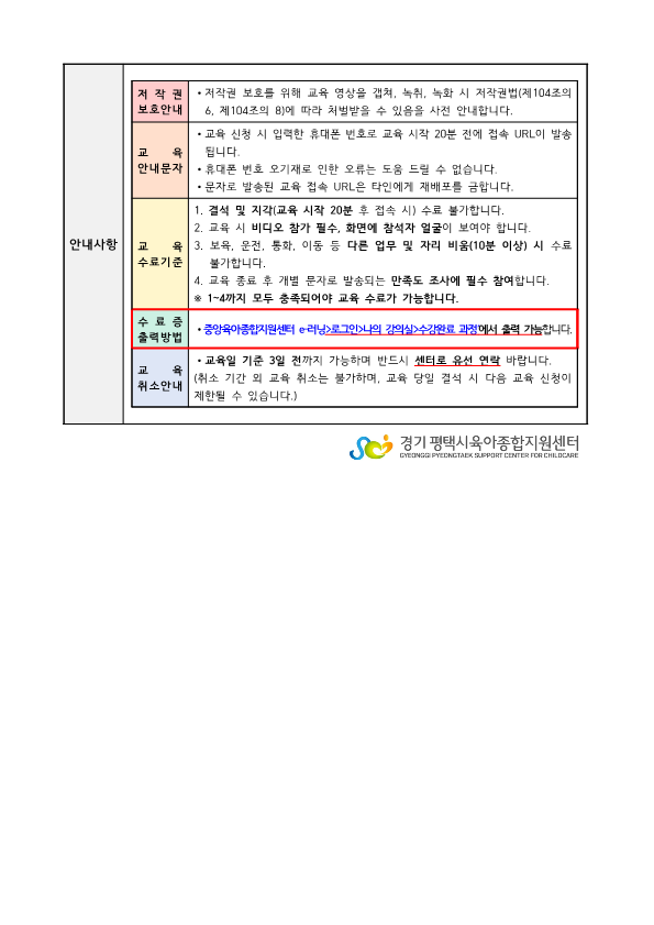 ※ 본 교육은 보수연계안전교육으로 중앙 E-러닝에서 교육 신청과 수료증 확인이 가능합니다.