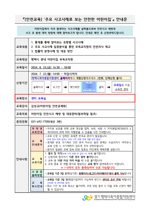 교육대상 평택시 관내 보육교직원 강사명 김성규(어린이집 안전공제회)