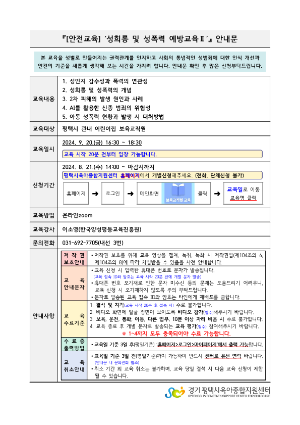 교육명 [안전교육] 성희롱 및 성폭력 예방교육 교육형태 온라인 zoom
