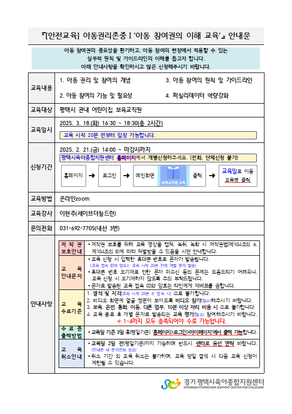 교육명 [안전교육] 아동권리존중Ⅰ'아동 참여권의 이해 교육' 교육형태 온라인 zoom