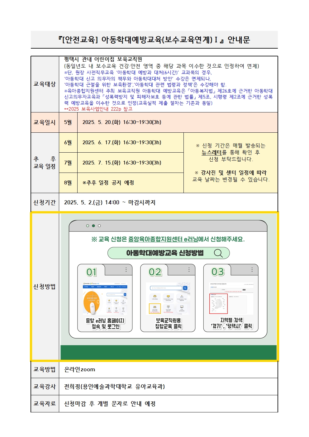 교육명 [안전교육] 5월 아동학대예방교육(보수교육연계) → ★중앙 E-러닝에서 신청★ 교육형태 온라인 zoom