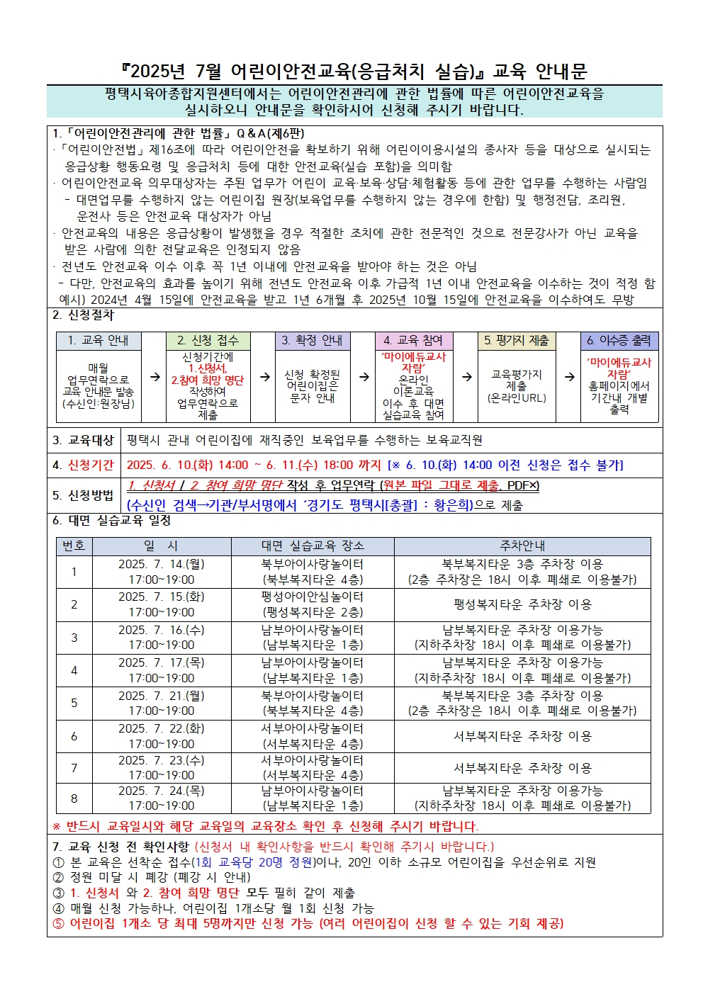 교육명 [안전교육] 7월 어린이안전교육(응급처치실습) 교육안내 - 업무연락으로 신청하기 교육형태 오프라인 소규모