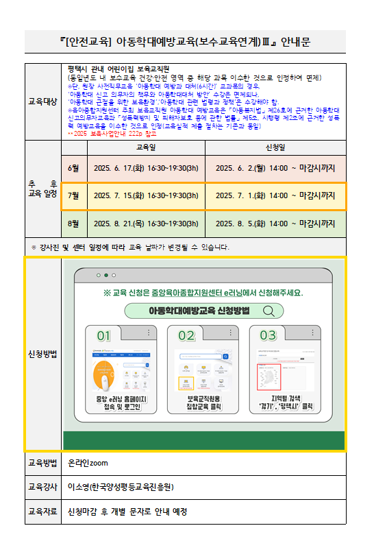 교육명 [안전교육] 7월 아동학대예방교육(보수교육연계) → ★중앙 E-러닝에서 7. 1.(화) 14:00 신청★ 교육형태 온라인 zoom