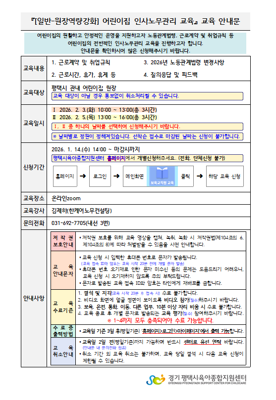 교육명 [일반-원장역량강화] 어린이집 인사노무관리 교육 교육형태 온라인 zoom
