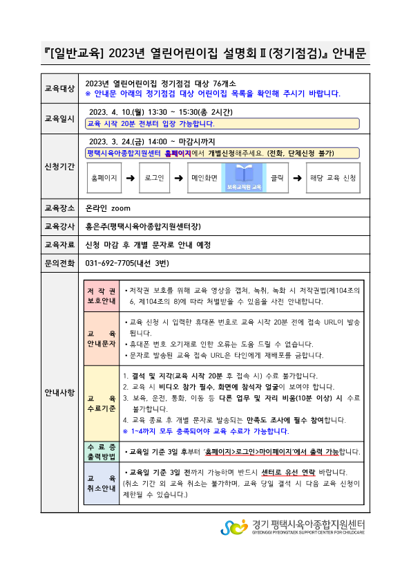 교육명 [일반교육] 2023년 열린어린이집 설명회(정기점검) 교육형태 온라인 zoom