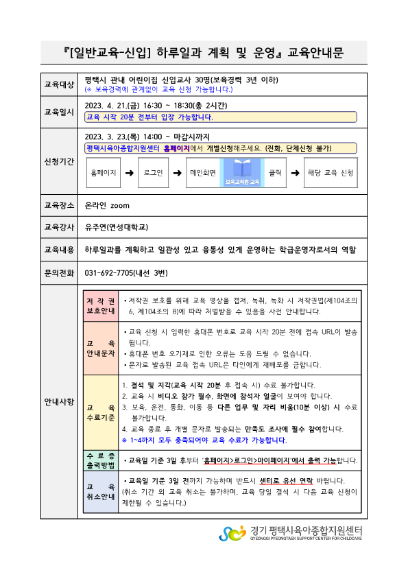 기타사항 ※ 교육은 신입교사 대상에 맞춰 진행되며 보육경력에 관계없이 교육 신청은 가능합니다.