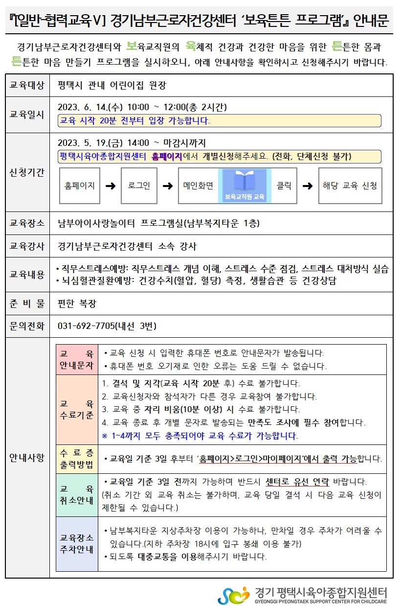 교육명 [일반-협력교육Ⅴ] 경기남부근로자건강센터 ‘보육튼튼 프로그램’-정원 미달로 폐강 교육형태 오프라인 소규모