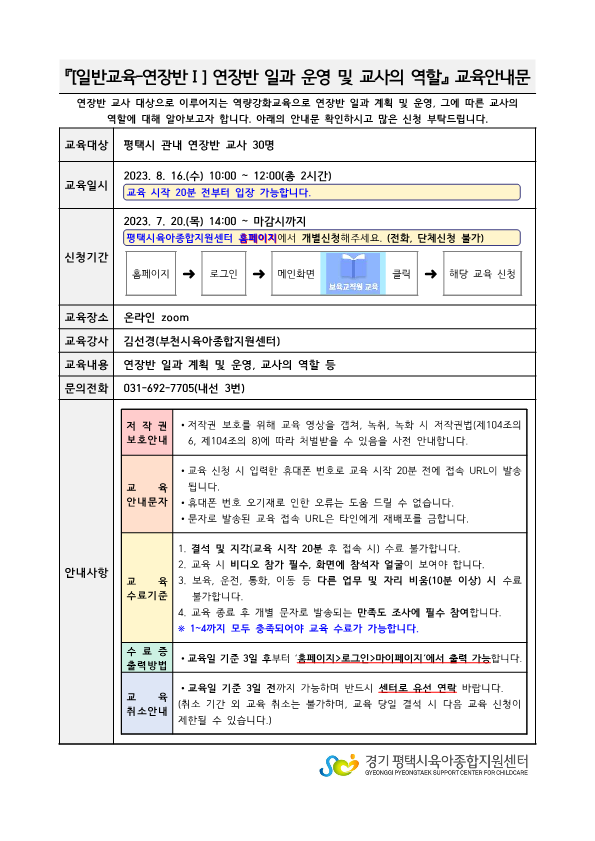교육대상 평택시 관내 어린이집 연장반 교사 강사명 김선경(부천시육아종합지원센터장)