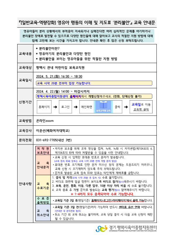 교육명 [일반교육-역량강화] 영유아 행동의 이해 및 지도Ⅲ '분리불안' 교육형태 온라인 zoom
